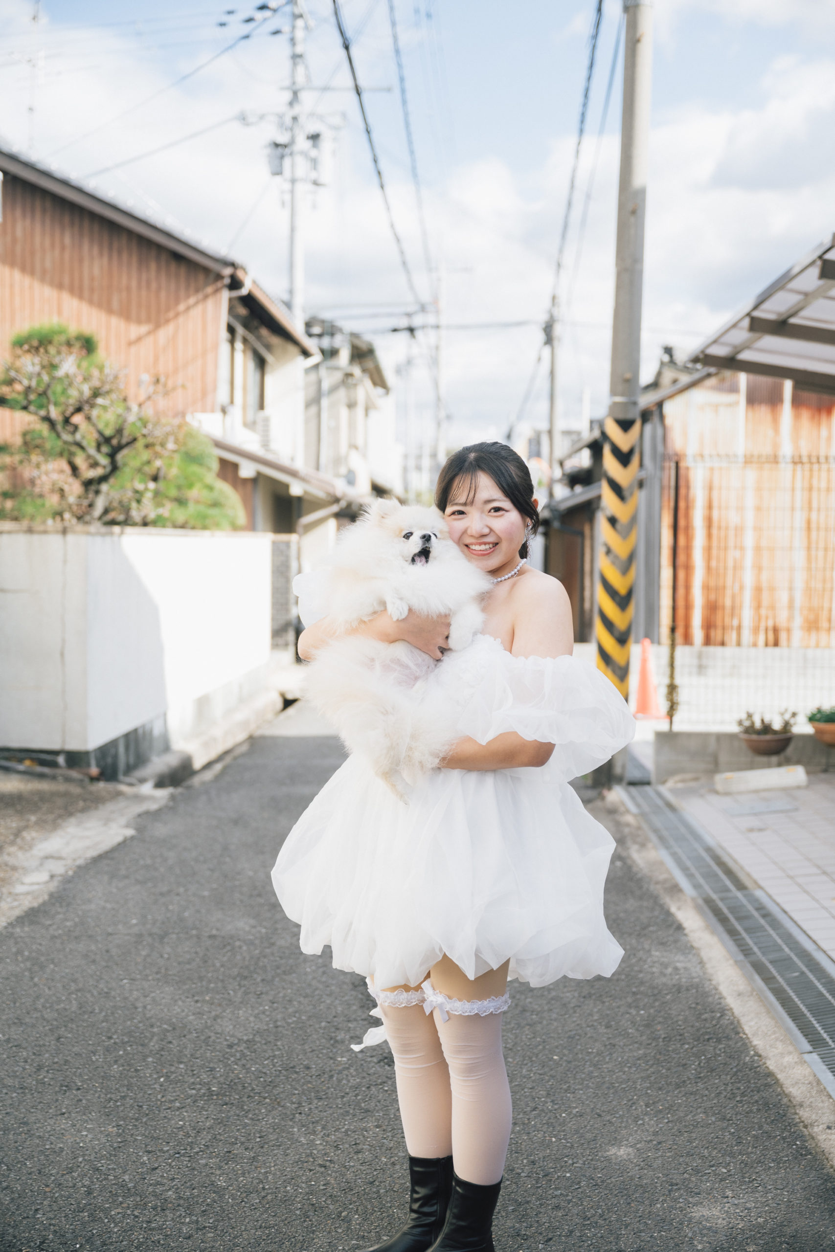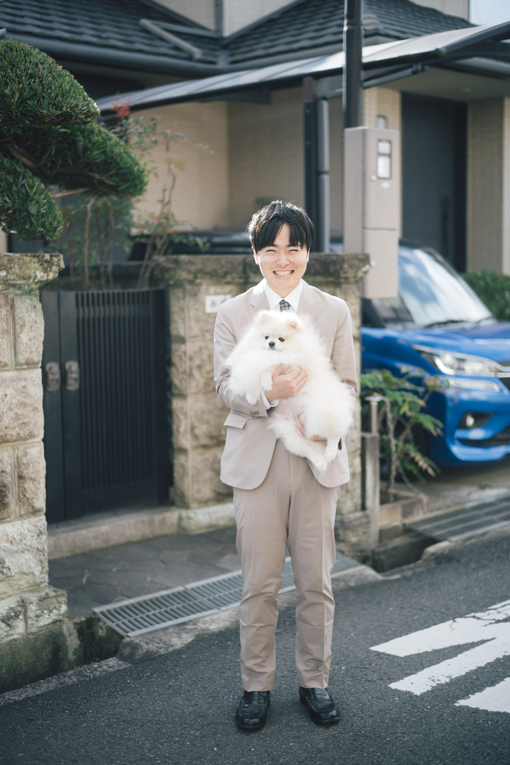 続いて、お二人のリクエストで、近所に住むご夫婦と一緒に暮らすポメちゃんとも撮影をしました。まだトリミングしてからそんなに立っていないそうですが、顔が見えないほどにもふもふになっていて微笑ましかったです。