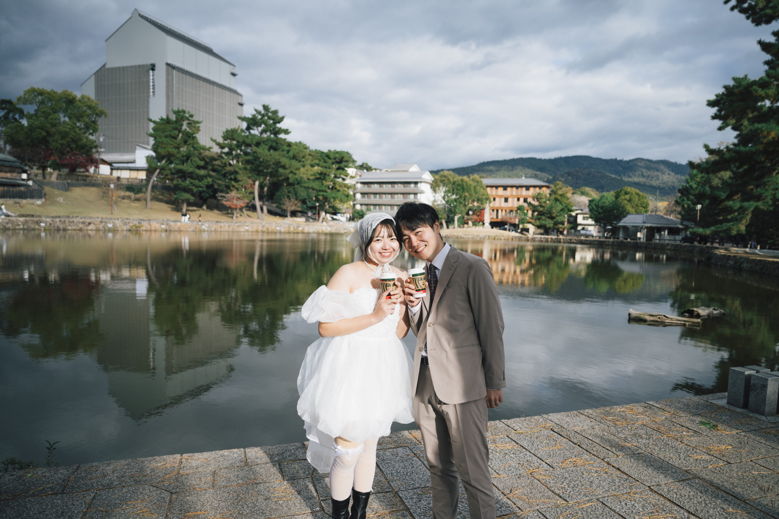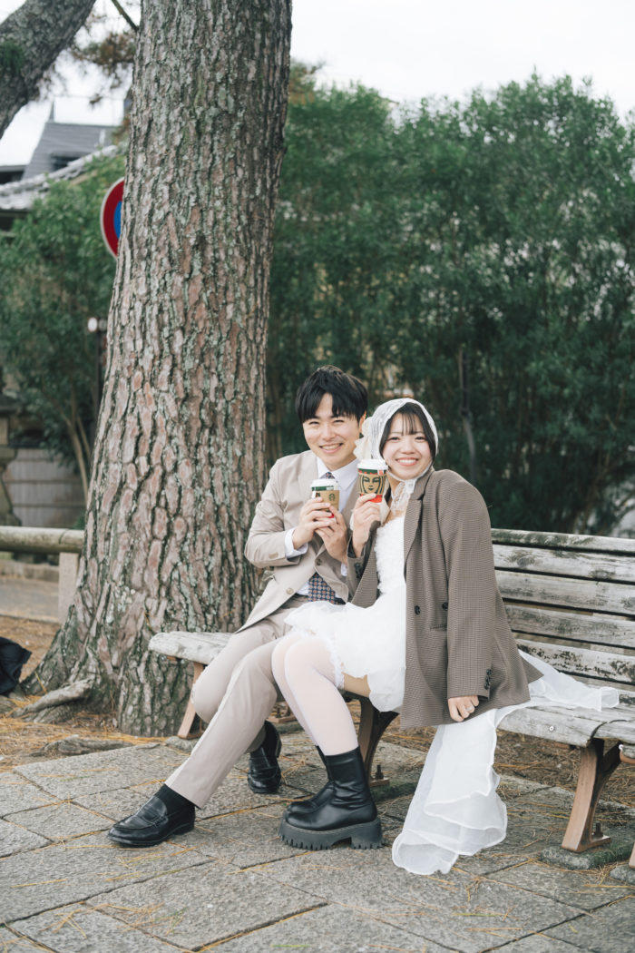 当初は遊園地での撮影をご希望でしたが、タイミングなども相談しながら、今回は「お二人の思い出のある場所」を中心に巡るロケーション撮影に。それぞれ奈良を代表する場所でありながら、そこにはお二人がこれまでに時間を重ねてきた気配が確かにありました。